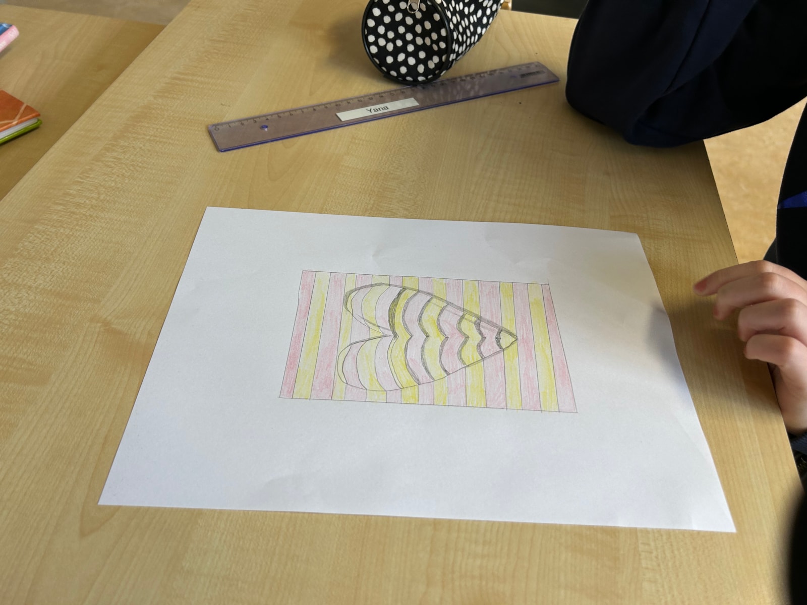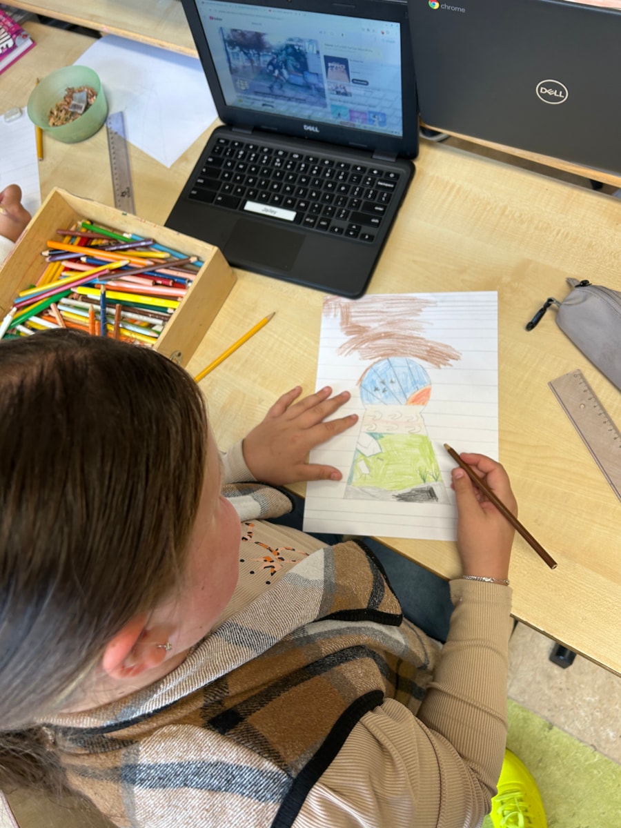 Het lijkt net alsof je een aquarium in loopt op die tekening of dat er een hand in het papier gedrukt staat. Of figuren die alsmaar door blijven lopen. Deze week hadden wij zo’n tekenopdracht.