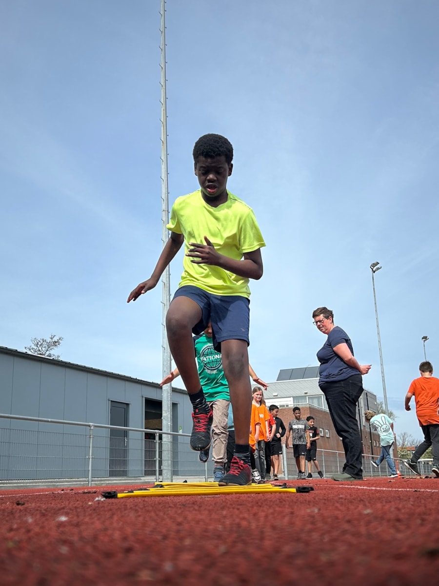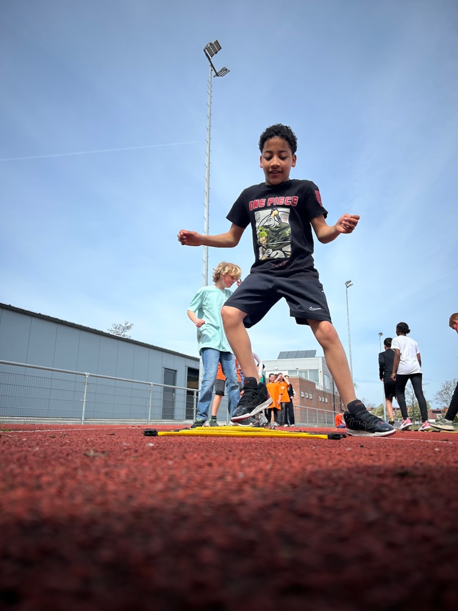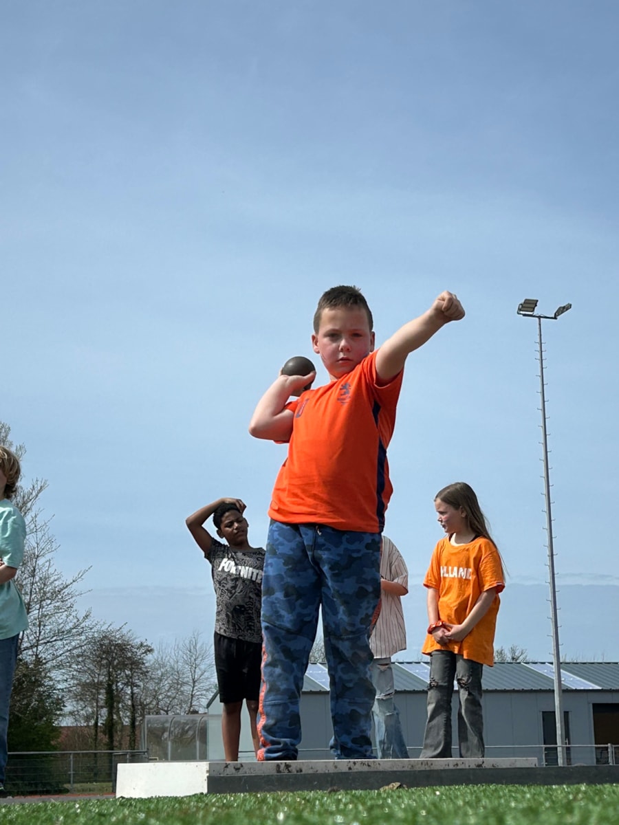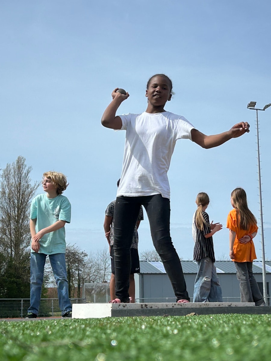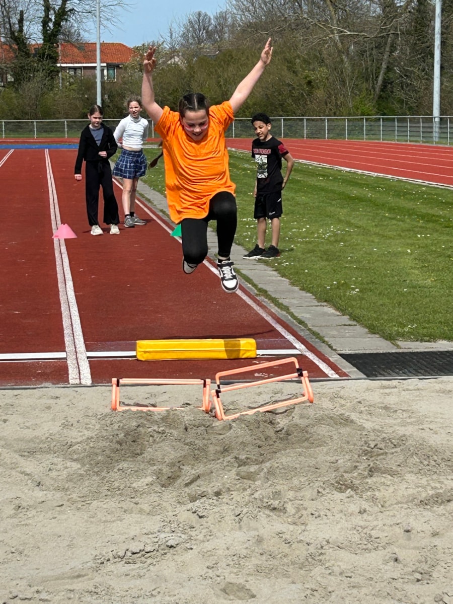 Vandaag stond de tweede les op het programma. Onder leiding van Samantha en haar medetrainer gingen we weer de baan op. We begonnen met warmlopen. Daarna gingen we in twee groepen uiteen: kogelstoten en verspringen. Het was heerlijk weer om lekker te sporten. We sloten de les af met een estafette.