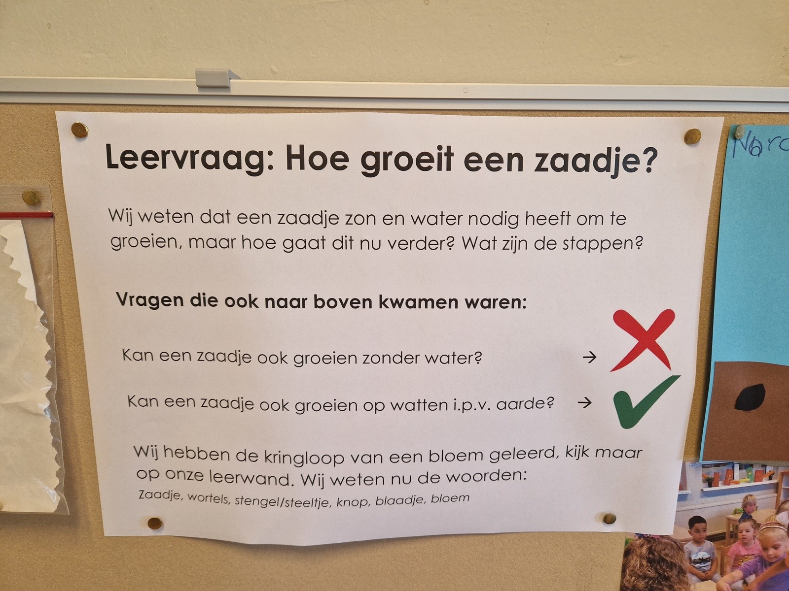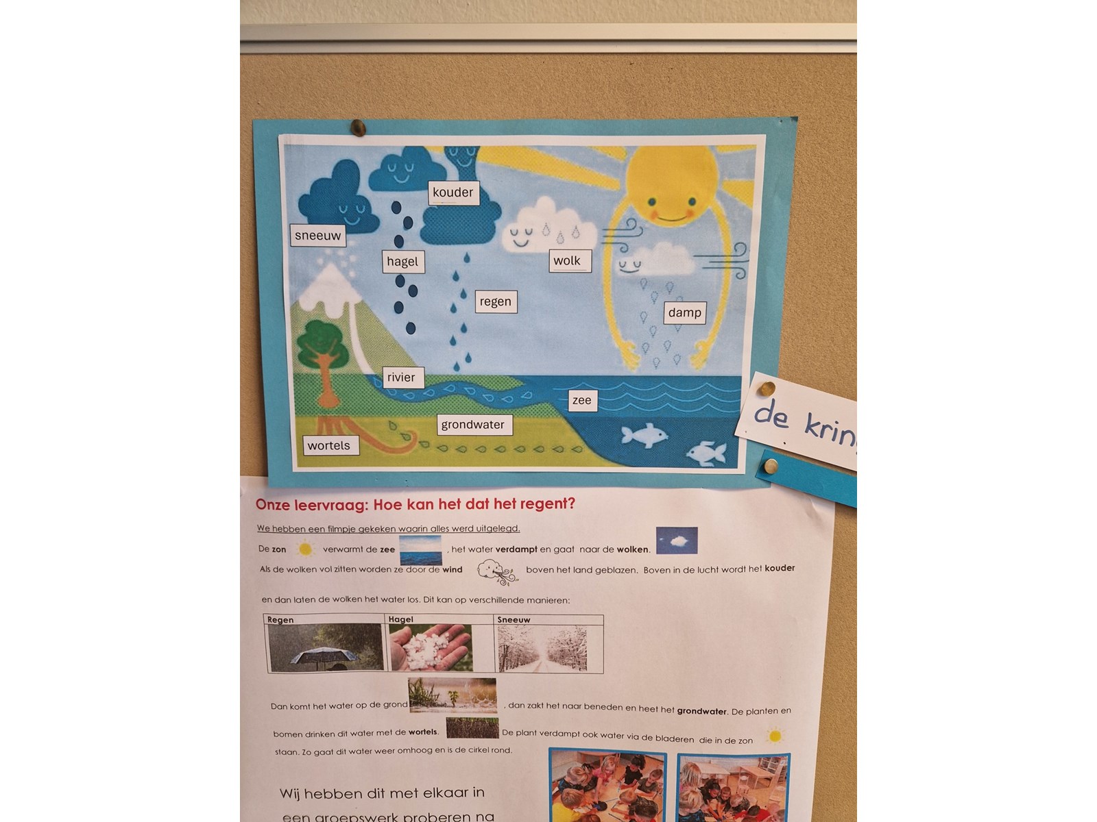 Het laatste thema van dit schooljaar gaat over water. Waar hebben we water allemaal voor nodig? Waar vinden we water? Welke vragen hebben wij over water? Water kom je overal tegen en we kunnen niet zonder. Het valt als regen uit de lucht, we drinken het net zo als de planten en dieren. Ook maken we ons zelf schoon in het water, badderen en douchen. We hebben veel proefjes gedaan met water. We zagen hoe stoom omgezet werd in waterdruppels, we ontdekten welke dingen blijven drijven en welke zinken en we proberen vlotten te bouwen die drijven. Water is natuurlijk ook gewoon leuk om lekker mee te spelen, zowel binnen in de watertafel als buiten met bellenblaas, tekenen op tegels en de bootjes laten varen in de Wadi.